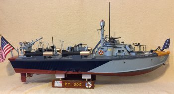 | This is a scratch built model of the P. T. 305 that was restored at the National WW2 museum in New Orleans. I was a volunteer during the restoration project. This display model is built using bass, balsa and mahogany. The mahogany used came from scraps left over from the real boat The model is 39 inches long or 1/24th scale. The color scheme is the color it used during it’s active service in the Mediterranean Sea. The model was donated to the WW2 museum and is on display at the boat house where the 305 is located. Nick Rightor |