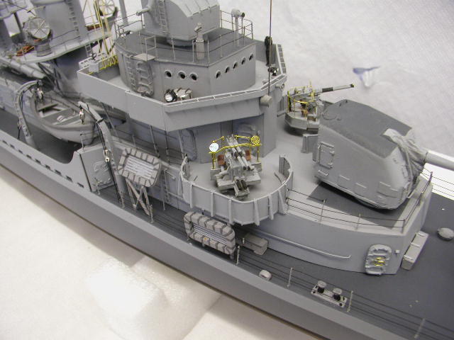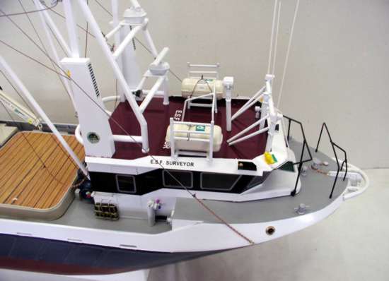 The model is based on a fiberglass hull with fender strips, freeing ports, and port detail molded into the hull. The main superstructure is also a detailed fiberglass molding with ladder recesses part of the molding.