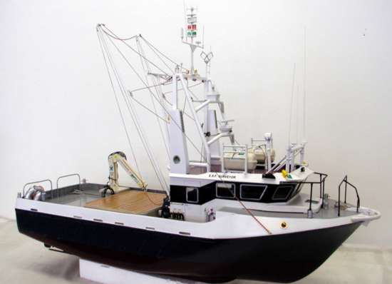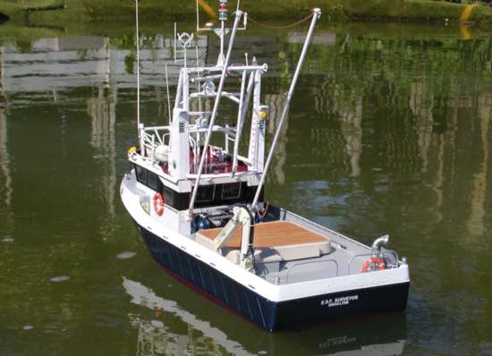 Beam: 10" (250mm) E.S.F. Surveyor is a fisheries research vessel designed by CAMMARC Ltd of Worthing, and constructed by the shipbuilders HALMATIC of Southampton in 1991. She was commissioned and run by the Eastern Sea Fisheries joint committee, and was stationed in Kings Lynn, Norfolk for fisheries research in and around the Wash and the north Norfolk coast. She has some very unusual design features in connection with her work. The complete bridge and wheelhouse is offset to the STB side with entrance doors only on the port side. This is to give clear space under decks and in the hold for the research laboratory that is capable of sucking up water, fish and bottom creatures, analyzing them in a continuous manner and depositing everything back in to the water through a stern opening unharmed, Anything of interest can be stored and carried back to base for further studies, along with pollution detection features that assist in protecting the valuable fishing beds in the wash. All the information gathered is transmitted continuously back the H Q with the powerful and complex communications fitted to her. She is flat bottomed with two skegs to protect the props and rudders to enable her to sit on the mudflats in the wash, launch and recover Gemini’s or research staff back on board. She has since been sold out of service and a new ship will be replacing her in 2011. The Model is based on a fiberglass hull with fender strips, and port detail moulded into the hull. Computer generated plastic for the main deck and superstructure is LASER CUT from 1.5mm HIPs plastic sheet for fast assembly, also included is plastic printed in 6 colors and is used for fine detail and finishing on the superstructure to give quick and crisp assembly. A full set of fittings in cast light alloy, resin and clear cast resin give the finishing touch to the model adding the vital clutter that is so much part of this attractive research vessel with so much appeal. A full set of waterslide decals for the color full markings and computer cut cast vinyl name decals, plus a set of warning symbols and signs to add the splash of color that makes this vessel stand out. As in all of the Deans kits a set of running gear is included, consisting of the prop shafts, tillers and full instructions keyed to a FULL SIZE plan with embedded color pictures to assist in the construction of the model. With her twin screws, set far apart, flat bottomed with twin skegs, the maneuverability of the models is outstanding as on par with the full size craft. Painting instructions are part of the construction notes with tips for using the latest car spray ACRYLIC paint which gives a fast and hard wearing finish.