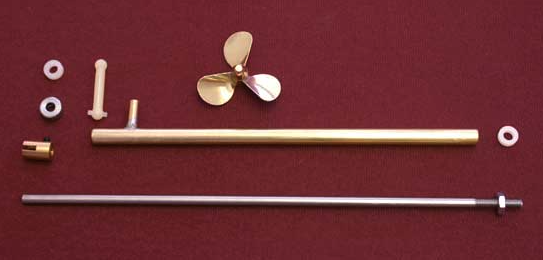 This direct drive single screw running hardware kit includes a 3/16″ dia. prop shaft, stuffing box, brass coupling and coupling rod. It also includes a 1 3/4″ diameter 3 bladed propeller.